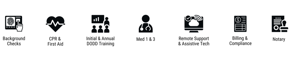 BackgroundChecks, CPR & First Aid, Initial & Annual DODD Training, Med 1 & 3, Remote Support & Assistive Tech, Billing & Compliance and Notary